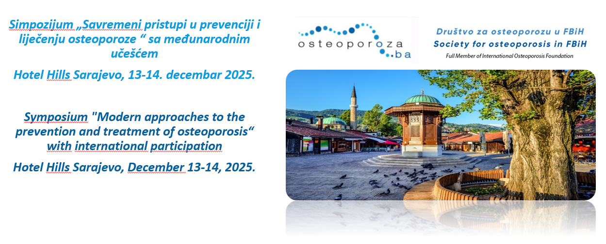 Dobro došli na web stranicu Društva za osteoporozu u Federaciji Bosne i Hercegovine Novosti Symposium”Modern approaches to the prevention and treatment of osteoporosis” with international participation 12 Oktobra, 2025 Godišnja i izborna Skupština Društva za osteoporozu u FBiH (DOB) 6 Maja, 2025 U Italiji održan Svjetski kongres osteoporoze, osteoartritisa i mišićno-koštanih bolesti 15 Aprila, 2025 Održan simpozijum Multidisciplinarni pristup osteoporozi sa međunarodnim učešćem 16 Decembra, 2024